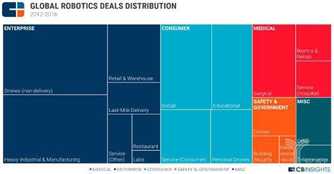 从下面的分布图能够看出,这里面包罗了沉工业和制制业正在内的各大行业。面向消费者的机械人投资正在过去5年中占比28%,面向医疗的占比13%。还有很小的一部门6.5%,流向了安保范畴。